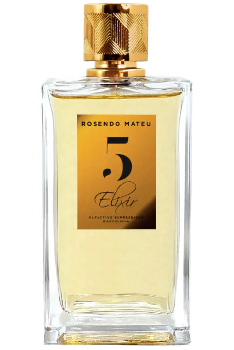 Rosendo Mateu Nº 5 Elixir de Rosendo Mateu Olfactive Expressions es una fragancia de la familia olfativa Oriental Especiada para Hombres y Mujeres. Esta fragrancia es nueva. Rosendo Mateu Nº 5 Elixir se lanzó en 2024. Las Notas de Salida son azafrán, notas especiadas y lirio de los valles (muguete); las Notas de Corazón son vainilla, haba tonka, fresa y ámbar; las Notas de Fondo son vainilla, ámbar y almizcle.